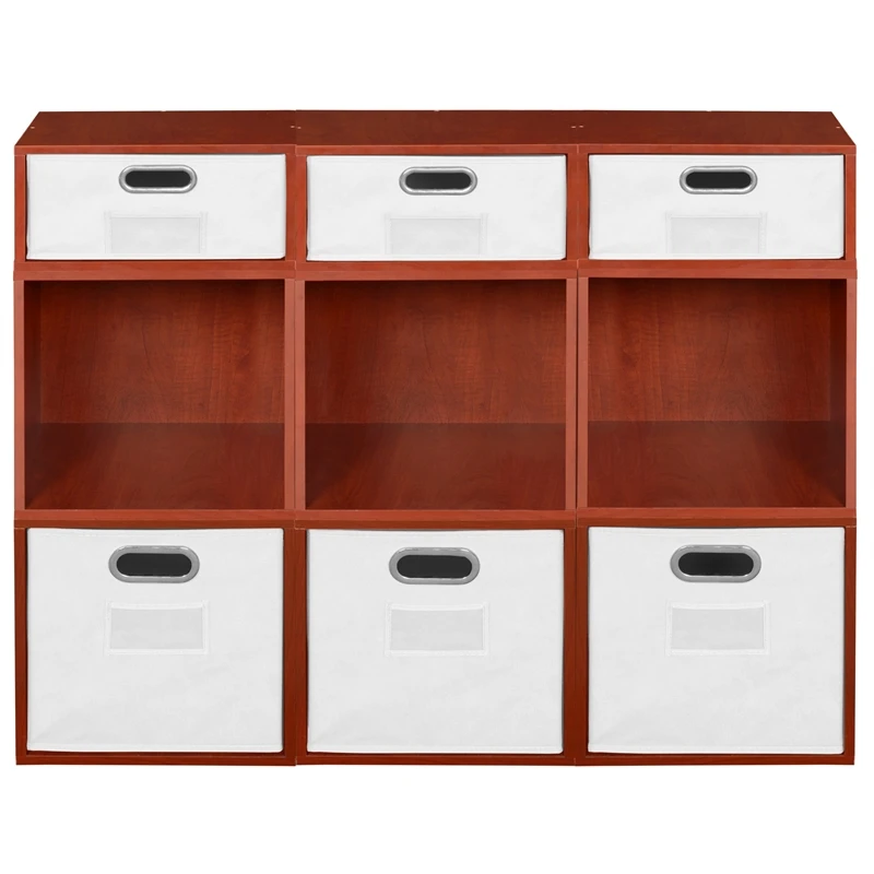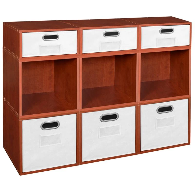 Let your creativity run wild with Cubo! This innovative set of 6 Full Size and 3 Half Size storage cubes by Niche are designed to fasten together in any direction! Connect them in any way you like. In a row, in a pyramid, in a U or L shape or countless other configurations. Cubes connect to one another with spring pins, making it easy to customize and create a storage system just for you with a single cube to a set of 12 or more. Niche storage cubes are actually cubes! They can be used in any direction. There’s no “right” way to use them because all sides measure the same! Who ever said all cubes had to face the front like a bookcase? Cubo storage cubes can attach together in any direction, which opens up a myriad of new design possibilities. Turn one to the right, turn another to the left. Keep one facing front and still another facing the back. Perfect to clean up clutter in closets, entryways, laundry & storage rooms, as a bookcase, nightstand or media storage, in a classroom or children’s room-these cubes fit anywhere! Its rich Cherry finish shows subtle wood grain and is sure to please and coordinates with the rest of the Niche line. No tools LockDowel assembly allows pieces to simply snap together and lock into place for a sturdy, hassle-free build in less than 2 minutes. No more searching for the right size screwdriver or dropping tiny screws. Just snap into place and go. Less hardware and fewer small parts means less plastic packaging and less waste. Arrange and rearrange the White Foldable Fabric Bins for a fresh, new custom look whenever you like!