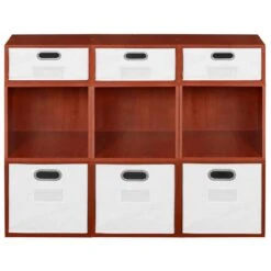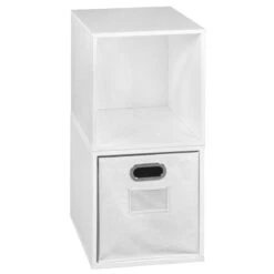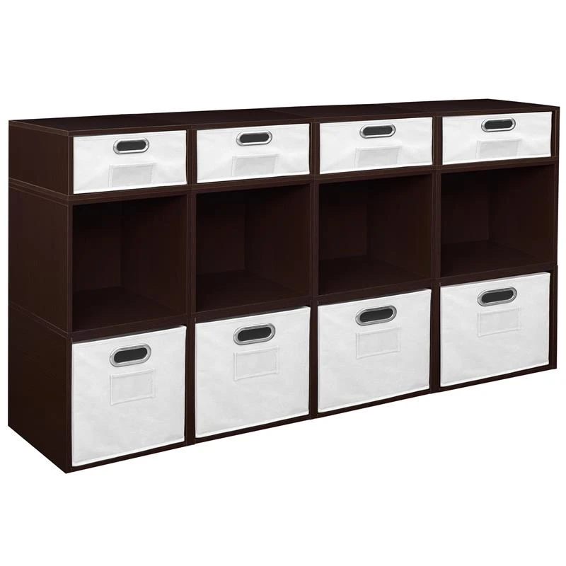 Let your creativity run wild with Cubo! This innovative set of 8 Full Size and 4 Half Size storage cubes by Niche are designed to fasten together in any direction! Connect them in any way you like. In a row, in a pyramid, in a U or L shape or countless other configurations. Cubes connect to one another with spring pins, making it easy to customize and create a storage system just for you with a single cube to a set of 12 or more. Niche storage cubes are actually cubes! They can be used in any direction. There’s no “right” way to use them because all sides measure the same! Who ever said all cubes had to face the front like a bookcase? Cubo storage cubes can attach together in any direction, which opens up a myriad of new design possibilities. Turn one to the right, turn another to the left. Keep one facing front and still another facing the back. Perfect to clean up clutter in closets, entryways, laundry & storage rooms, as a bookcase, nightstand or media storage, in a classroom or children’s room-these cubes fit anywhere! Its rich dark Truffle finish shows subtle wood grain and is sure to please and coordinates with the rest of the Niche line. No tools LockDowel assembly allows pieces to simply snap together and lock into place for a sturdy, hassle-free build in less than 2 minutes. No more searching for the right size screwdriver or dropping tiny screws. Just snap into place and go. Less hardware and fewer small parts means less plastic packaging and less waste. Arrange and rearrange the White Foldable Fabric Bins for a fresh, new custom look whenever you like!