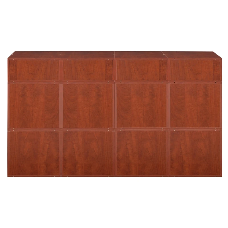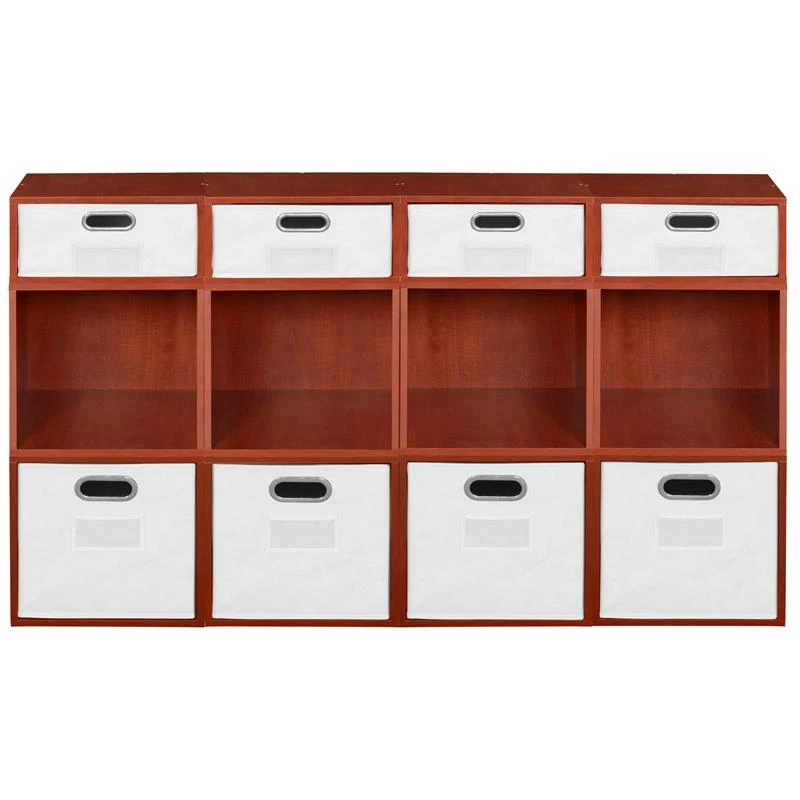 Let your creativity run wild with Cubo! This innovative set of 8 Full Size and 4 Half Size storage cubes by Niche are designed to fasten together in any direction! Connect them in any way you like. In a row, in a pyramid, in a U or L shape or countless other configurations. Cubes connect to one another with spring pins, making it easy to customize and create a storage system just for you with a single cube to a set of 12 or more. Niche storage cubes are actually cubes! They can be used in any direction. There’s no “right” way to use them because all sides measure the same! Who ever said all cubes had to face the front like a bookcase? Cubo storage cubes can attach together in any direction, which opens up a myriad of new design possibilities. Turn one to the right, turn another to the left. Keep one facing front and still another facing the back. Perfect to clean up clutter in closets, entryways, laundry & storage rooms, as a bookcase, nightstand or media storage, in a classroom or children’s room-these cubes fit anywhere! Its rich Cherry finish shows subtle wood grain and is sure to please and coordinates with the rest of the Niche line. No tools LockDowel assembly allows pieces to simply snap together and lock into place for a sturdy, hassle-free build in less than 2 minutes. No more searching for the right size screwdriver or dropping tiny screws. Just snap into place and go. Less hardware and fewer small parts means less plastic packaging and less waste. Arrange and rearrange the White Foldable Fabric Bins for a fresh, new custom look whenever you like!
