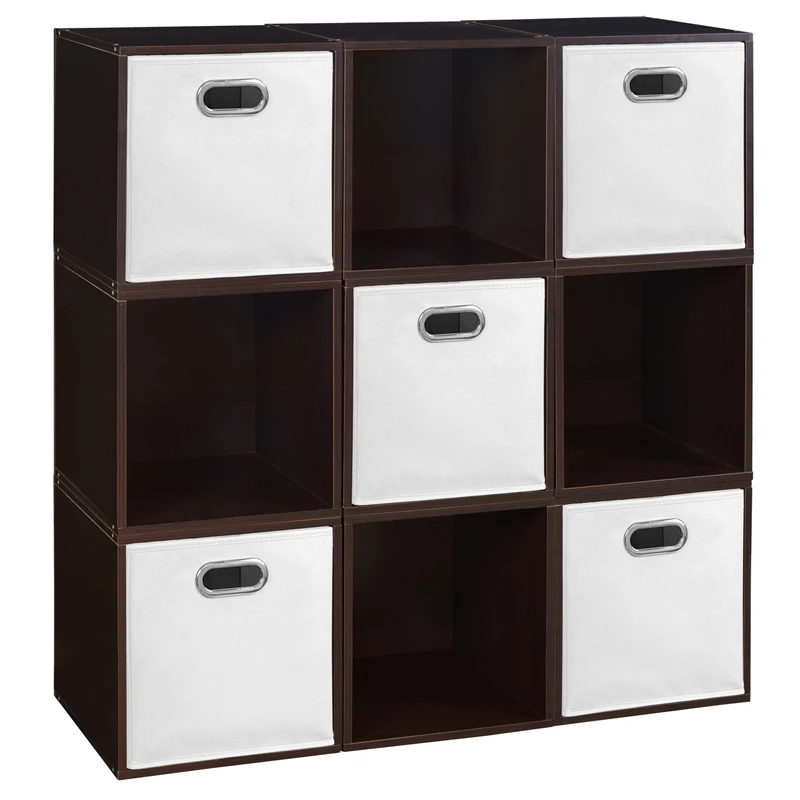 Let your creativity run wild with Cubo! This innovative set of 9 storage cubes by Niche are designed to fasten together in any direction! Connect them in any way you like. In a row, in a pyramid, in a U or L shape or countless other configurations. Start small and add on later. Cubes connect to one another with spring pins, making it easy to customize and create a storage system just for you with a single cube to a set of 12 or more. Niche storage cubes are actually cubes! The Fabric Storage Bins measure 12 x 12 x 12, which integrate seamlessly into Niche Cubo storage cubes (interior dimensions 12 1/8″ x 12 1/8″ x 12 1/8″). There’s no “right” way to use them because all sides measure the same! Who ever said all cubes had to face the front like a bookcase? Cubo storage cubes can attach together in any direction, which opens up a myriad of new design possibilities. Turn one to the right, turn another to the left. Keep one facing front and still another facing the back. Perfect to clean up clutter in closets, entryways, laundry & storage rooms, as a bookcase, nightstand or media storage, in a classroom or children’s room-these cubes fit anywhere! Its rich dark Truffle finish shows subtle wood grain and is sure to please and coordinates with the rest of the Niche line. No tools LockDowel assembly allows pieces to simply snap together and lock into place for a sturdy, hassle-free build in less than 2 minutes. No more searching for the right size screwdriver or dropping tiny screws. Just snap into place and go. Less hardware and fewer small parts means less plastic packaging and less waste. Arrange and rearrange the 5 White Foldable Fabric Bins for a fresh, new custom look whenever you like!