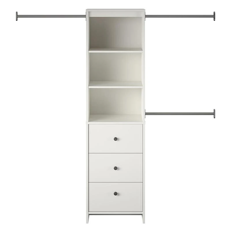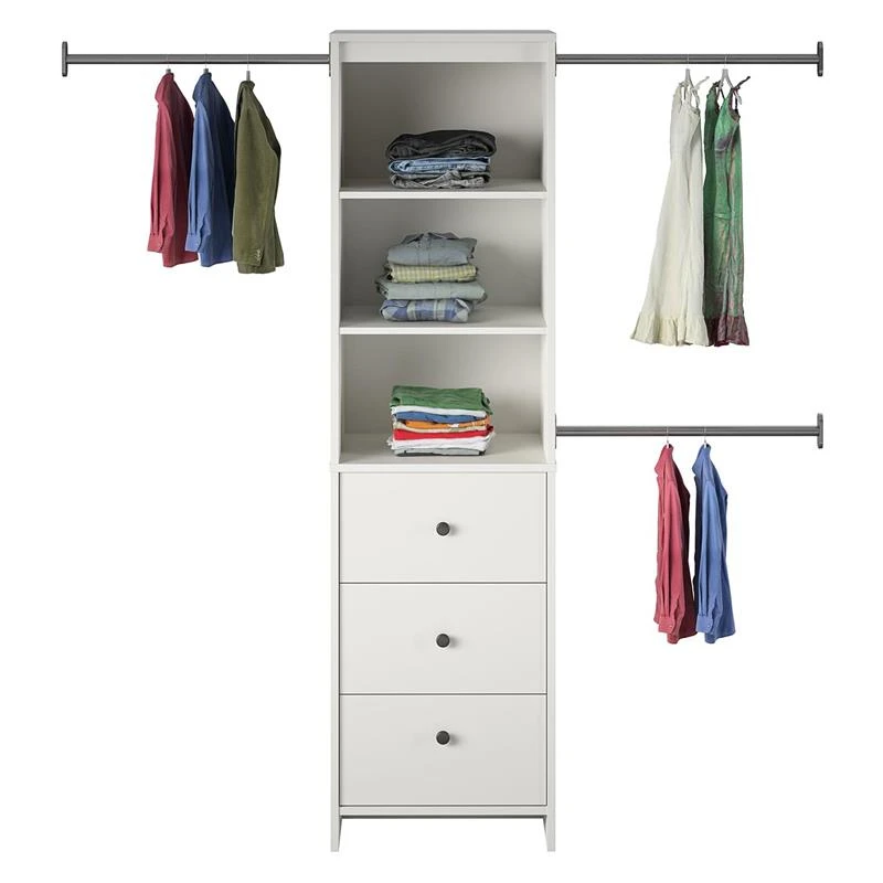- The simple, yet sleek look of this system brings just enough storage with 3 adjustable clothing rods, 3 shelves, and 3 concealed drawers. Finished in a crisp white paper laminate, this sturdy particleboard and metal combination will last for years