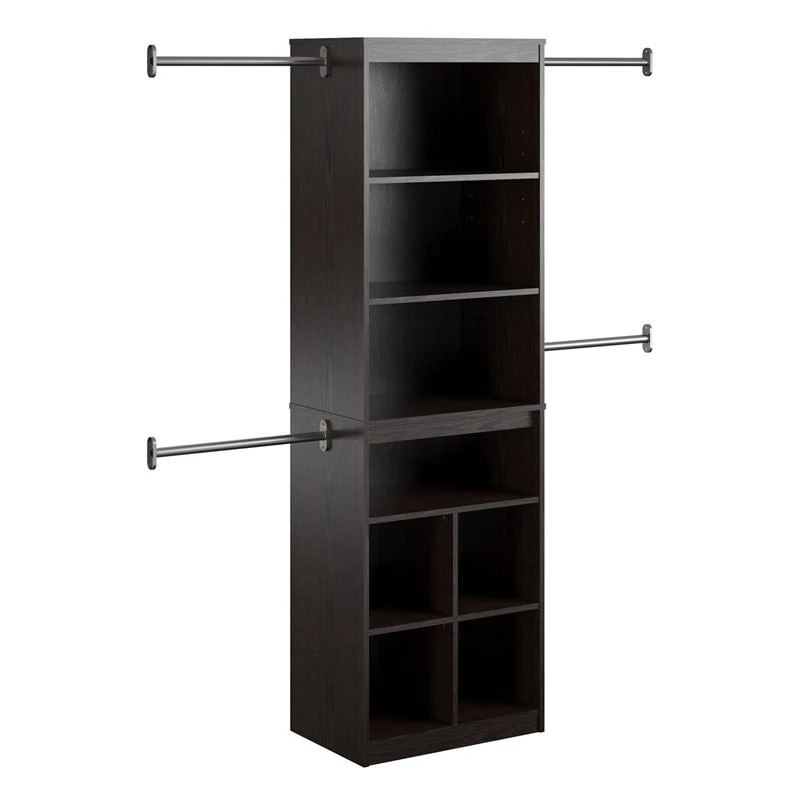 - The simple, yet sleek look of this system brings just enough storage with 4 adjustable clothing rods, 4 shelves (1 adjustable), and 4 shoe cubbies