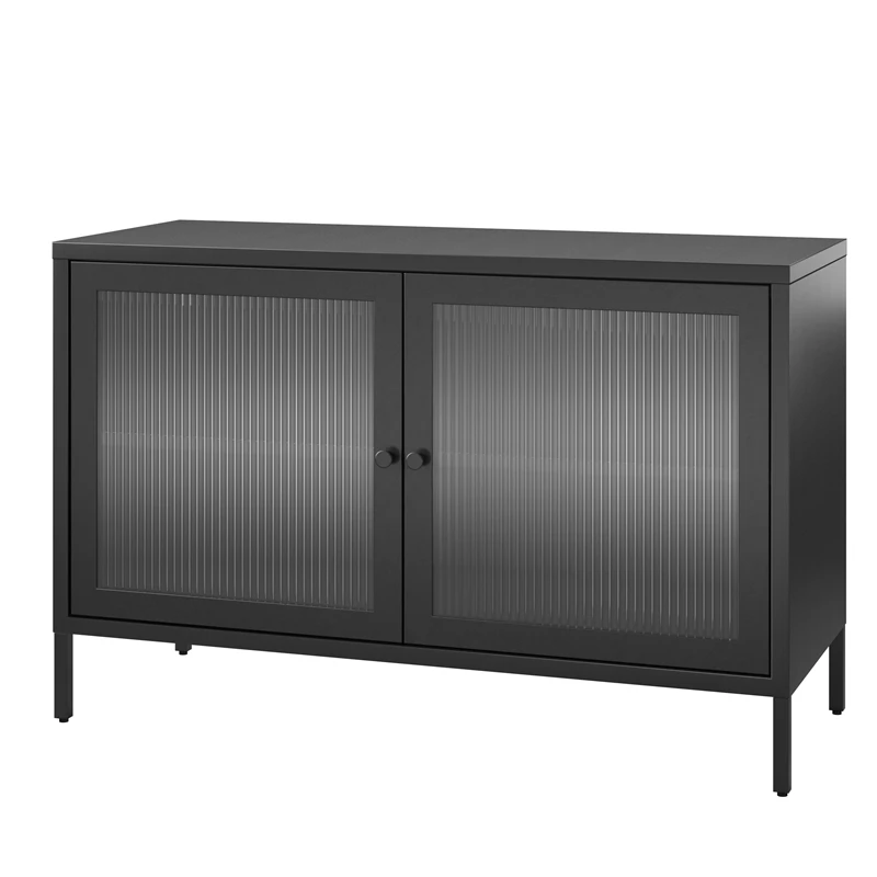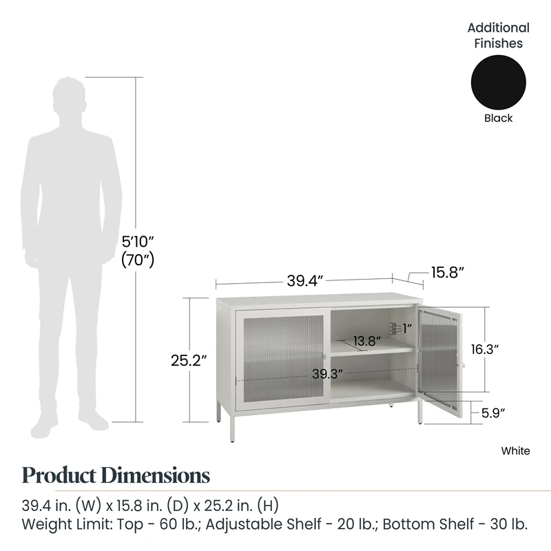 Storage just got sophisticated with this piece. Store and stack your way to a more organized living space. The gorgeous Metal 2 Door Storage Cabinet with Fluted Glass is a throwback on the metal locker design with added elegant fluted glass to discretely store books, games, pantry items and so much more. Constructed from powder coated metal and fluted glass, the 2 Door Storage Cabinet is fitting for the bedroom, guestroom, bathroom, entryway, kitchen, laundry room, living room, den or reany room in the house! The Cabinet ships flat in one box and requires minimal assembly. Two adults are recommended to assemble. Once assembled, the Storage Cabinet measures to be 39.37” W x 15.75” D x 25.2” H.