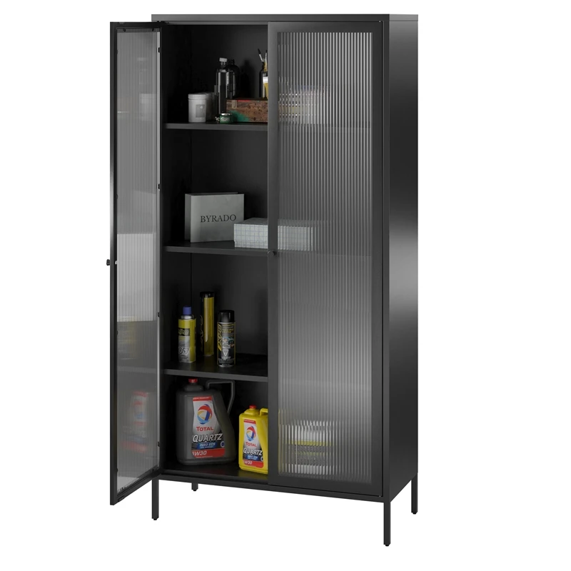 Storage just got sophisticated with this piece. Store and stack your way to a more organized living space. The gorgeous Tall Metal 2 Door Storage Cabinet with Fluted Glass is a throwback on the metal locker design with added elegant fluted glass to discretely store books, games, pantry items and so much more. Constructed from powder coated metal and fluted glass, the Tall Storage Cabinet is fitting for the bedroom, guestroom, bathroom, entryway, kitchen, laundry room, living room, den or reany room in the house! The Cabinet ships flat in one box and requires minimal assembly. Two adults are recommended to assemble. Once assembled, the Storage Cabinet measures to be 35.38” W x 15.75” D x 72.83” H.