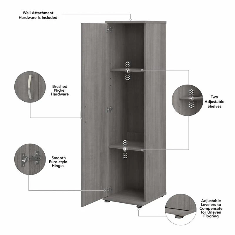 The Pemberly Row Business Furniture Narrow Linen Tower with Door and Shelves features a commercial quality design that’s built to last and provides ample room for organization. Store laundry detergent and supplies along with spare sheets, towels and more inside a practical utility cabinet that promises to maintain its contemporary style throughout years of reliable use. The door opens on smooth Euro-style hinges to reveal one fixed shelf and two adjustable shelves for flexible storage. Each shelf supports up to 35 pounds, so storing larger materials is no problem. The freestanding floor cabinet’s base includes adjustable levelers to compensate for uneven surfaces and wall attachment hardware is included for family-friendly safety. This tall laundry cabinet has been meticulously tested to meet or exceed ANSI/BIFMA standards for safety and performance and is backed by a 10 Year Warranty.