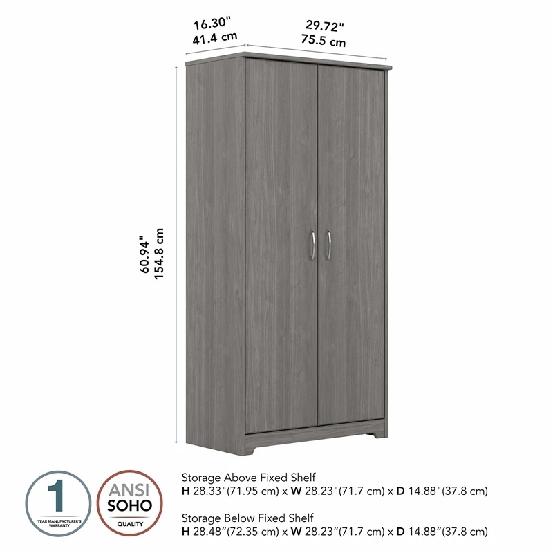 - Tall cabinet’s doors feature smooth Euro-style hinges for an effortless open and close