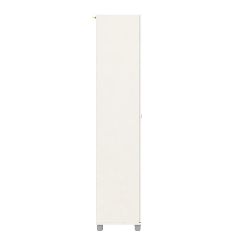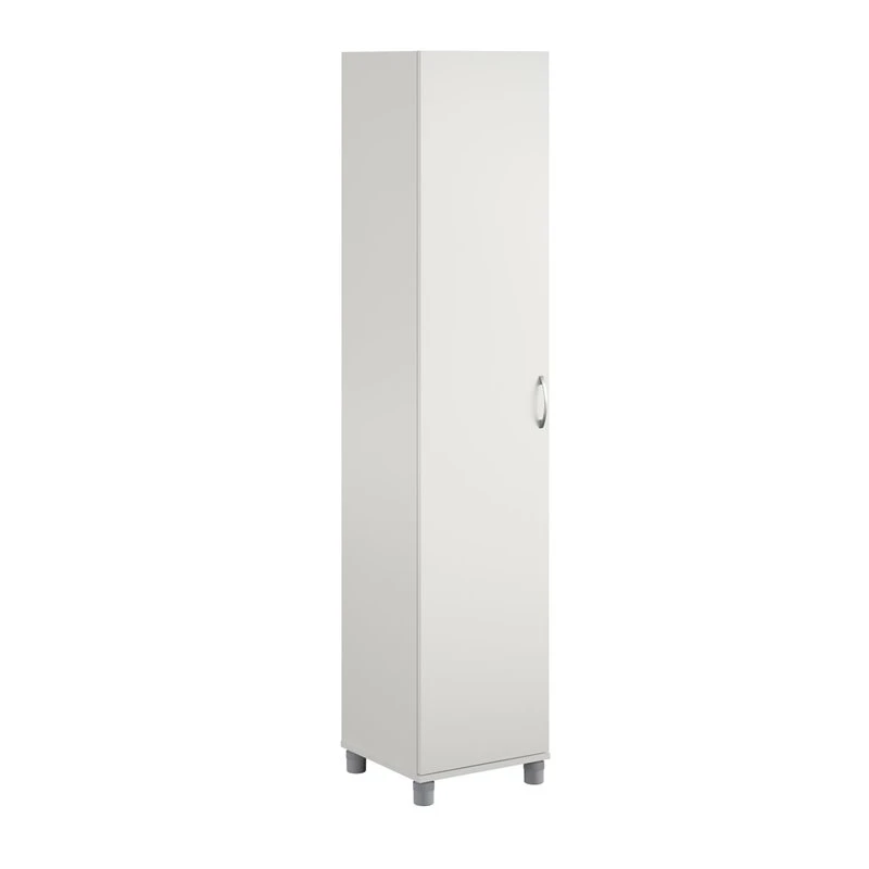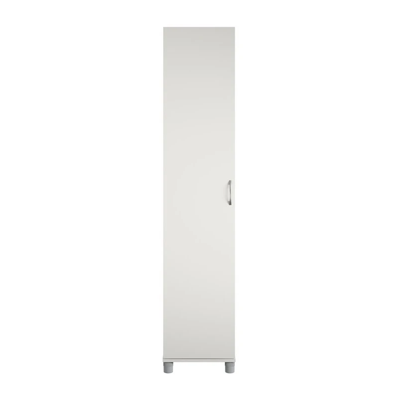 Add extra storage space to any room in your home with the Pemberly Row 16” Storage Cabinet. Made of laminated particleboard, the clean white finish pairs with any décor so the Cabinet can be used anywhere. The interior of this Cabinet features 5 shelves, 3 adjustable, allowing you to customize your storage for both small and large items. Store and organize anything from office supplies to cleaning supplies and even kitchen pantry items. The adjustable feet make keeping your Cabinet level on uneven floors simple. A wall anchor kit is included to secure the Cabinet to the wall and prevent tipping injuries. Use this piece as a stand-alone item, or combine it with additional Pemberly Row storage items to create the perfect storage solution for your home. The Storage Cabinet ships flat to your door and 2 adults are recommended to assemble. Once assembled, the Cabinet measures to be 74.29”H x 15.67”W x 15.39”D.