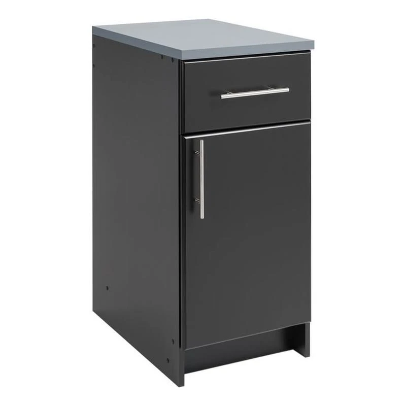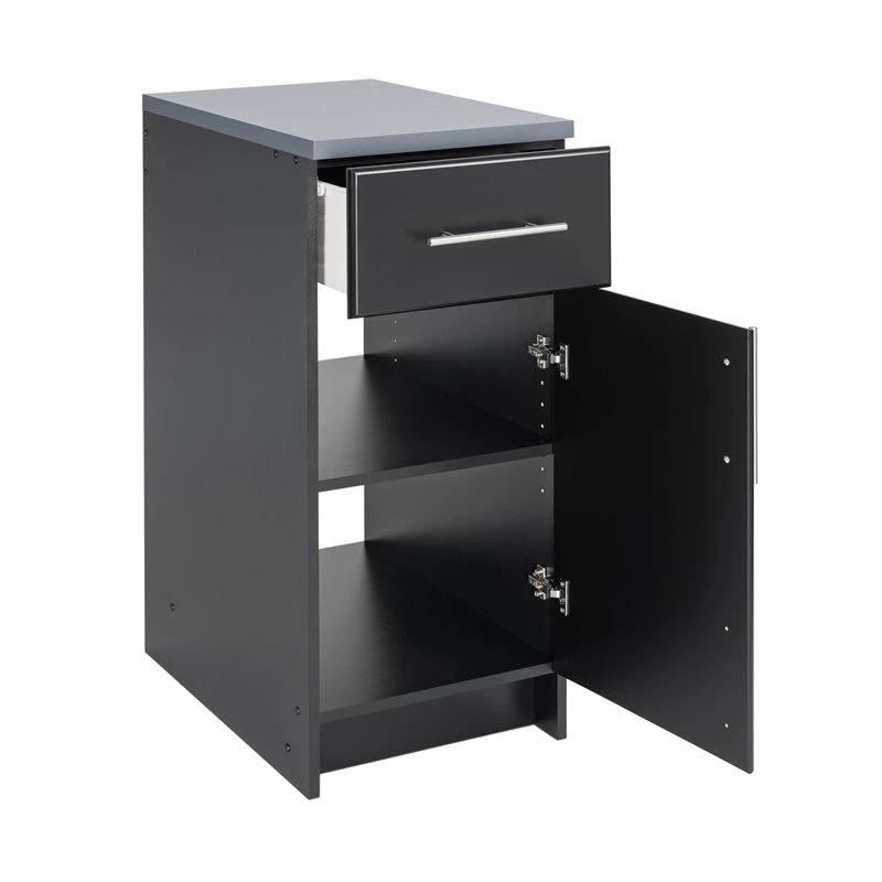 The 16” Base Cabinet combines the storage of a 20 inch long drawer and the versatility of a door that can be easily mounted to open left or right. The heavy duty drawer has a half-inch thick bottom and metal sides that roll on smooth roller glides, making it perfect for storing heavy duty items like tools. The cabinet includes one adjustable shelf and 1” thick worktop. Customizable, functional and durable, it coordinates perfectly with other pieces in the Collection.