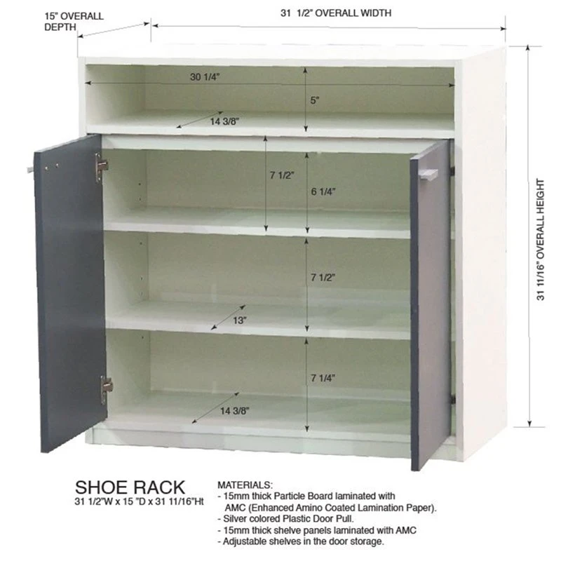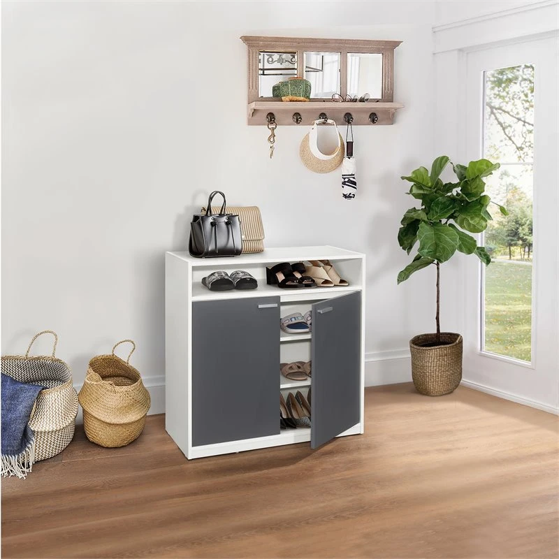 Moretz 2-Door Shoe Storage Cabinet, White & Gray Wood. Organize clutter while adding to your decor with this freestanding Moretz Shoe Cabinet, offering plenty of storage for your bedroom or entryway. Constructed of manufactured wood with a streamlined frame and clean design for a modern edge, its crisp white finish and gray accents complement the overall design. Two adjustable shelves behind the doors and an open shelf up top offer plenty of tuck-away and display storage space for shoes and other footwear and make it easier to access your favorite pairs while the closed-back and silver accented door pulls complete the look.