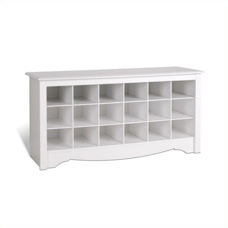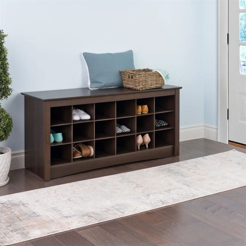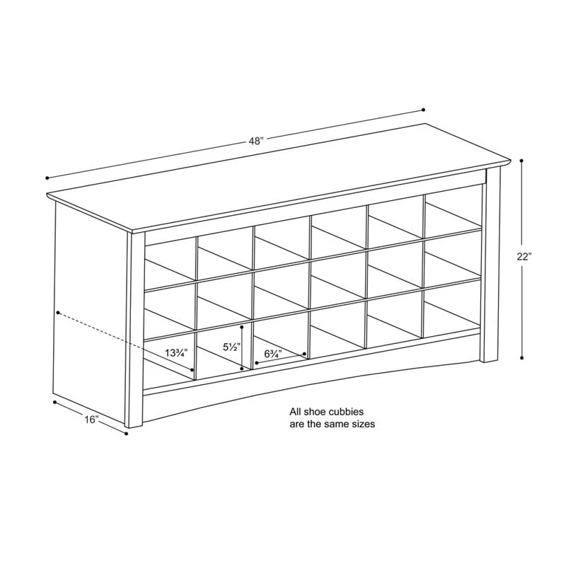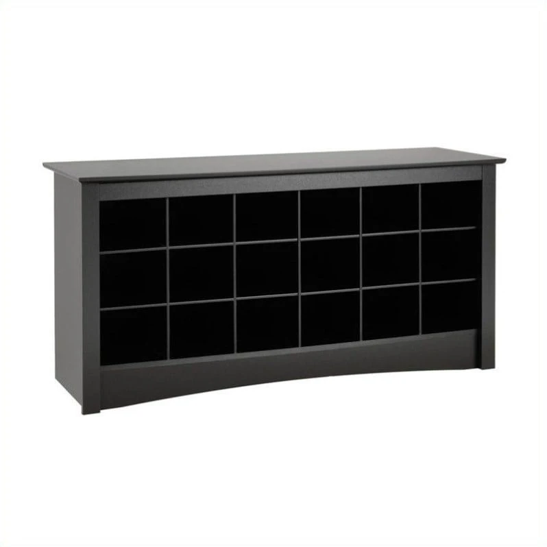 Sit down and slip on your shoes. Doesn’t it make sense to haveyour shoes stored in the same place as you put them on? This dualpurpose product is both stylish and functional, and is a great additionto a front entrance way, mudroom, or utility room. Each of the 18cubbies measure 6W x 5H x 13D, which make them large enough to holdmen’s size 13 shoes! Pair this bench with Prepac’s Sonoma Black Cubbie Shelf/Wall Coat Rack for added functionality. Some assembly is required.