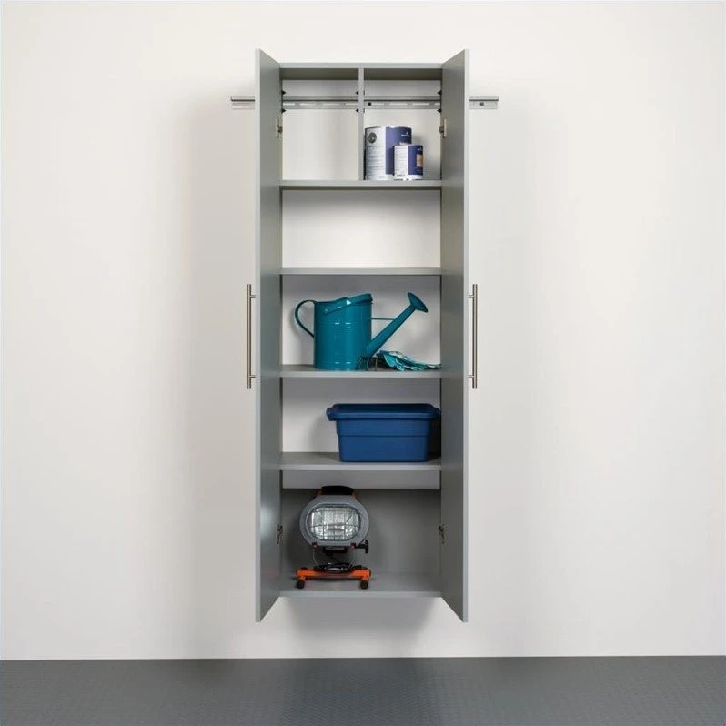 The HangUps Large Storage Cabinet offers versatility for your ever changing storage needs in the garage, laundry room, office or workshop. This cabinet mounts securely to the wall with a heavy duty metal rail and hook system. The wall mounted feature ensures easy cleaning beneath the cabinets and protects your stored items from water & dirt. The HangUps Collection is constructed using industrial grade laminated composite wood and features metal handles and adjustable hinges. This product ships ready-to-assemble and includes all hanging rails and fastening bolts. Add other cabinets from our HangUps Collection to create a storage system to convert any cluttered room into an organized space.
