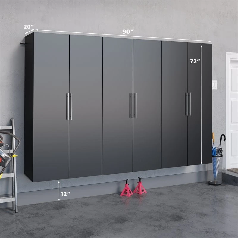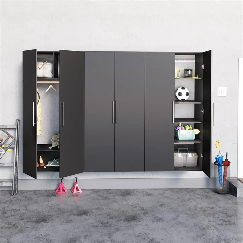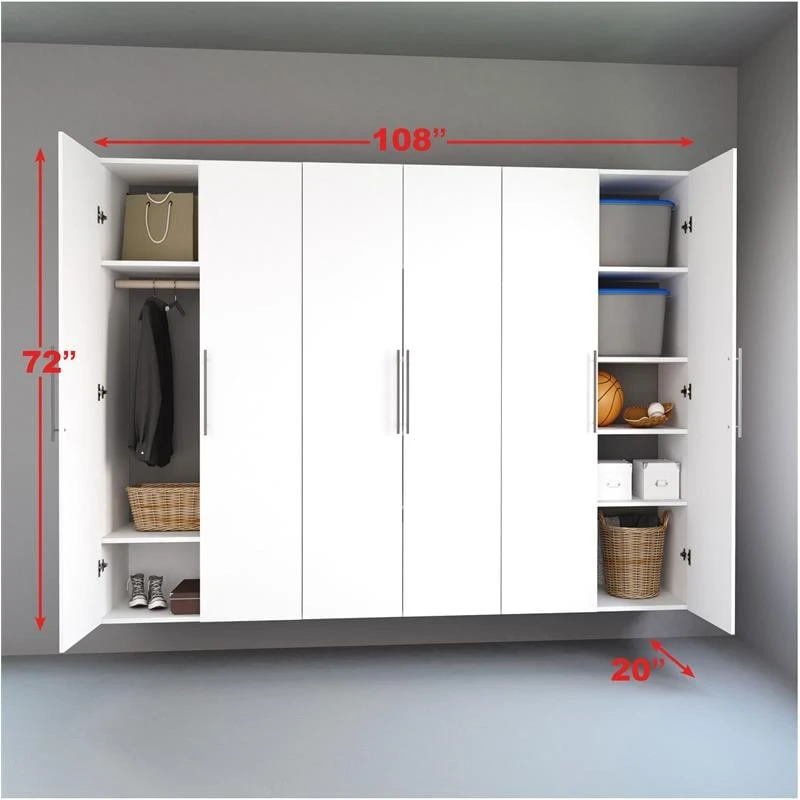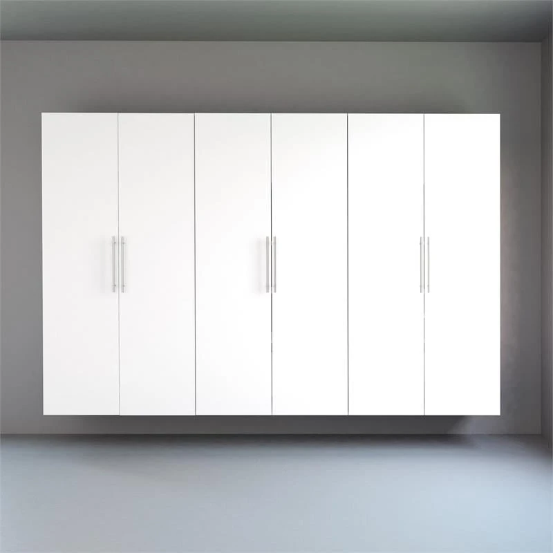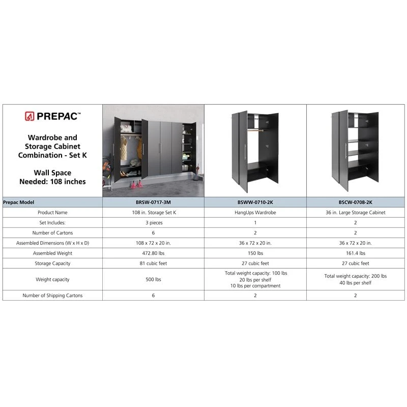 The HangUps Storage Cabinet Collection offers versatility for your ever changing storage needs in the garage, laundry room, office or workshop. The Cabinets mount securely to the wall with a heavy duty metal rail and hook system. The wall mounted feature ensures easy cleaning beneath the cabinets and protects your stored items from water and dirt. The HangUps Collection is constructed using laminated composite wood and features metal handles and adjustable hinges. This product ships ready-to-assemble and includes all hanging rails and fastening bolts. Add other cabinets from our HangUps Collection to create a storage system to convert any cluttered room into an organized space. Set K Includes: 1x 36″ Wardrobe Cabinet (BSWW-0710-2K), 2x 36″ Storage Cabinet (BSCW-0708-2K).