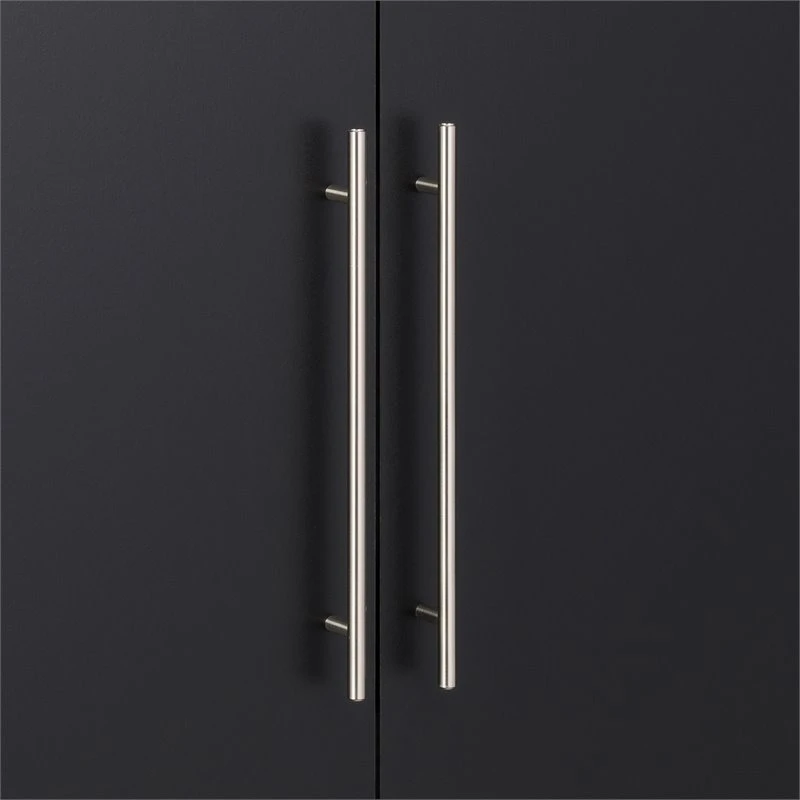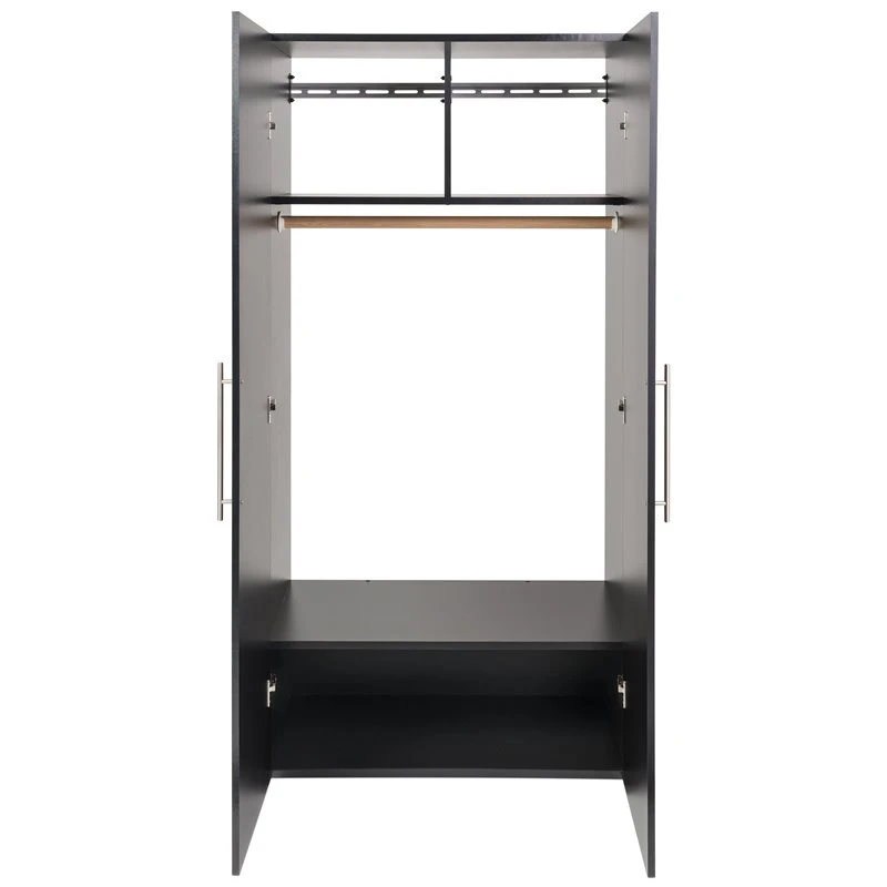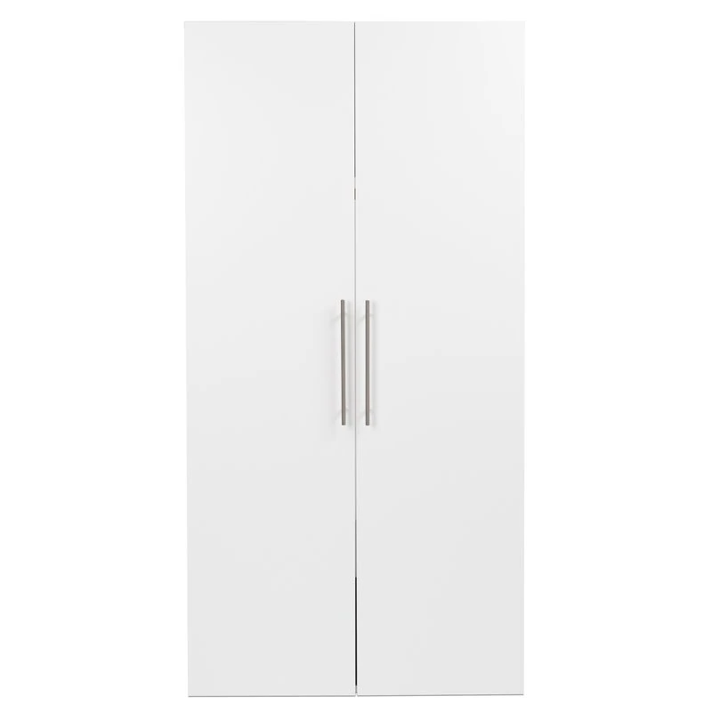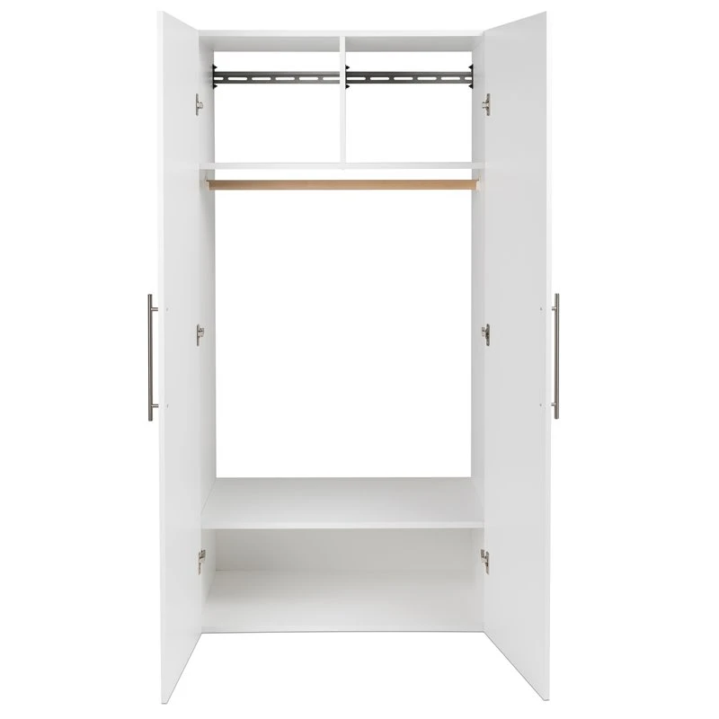 The HangUps 36″ Wardrobe Cabinet offers versatility for your ever changing storage needs in the garage, laundry room, office or workshop. The Wardrobe Cabinet mounts securely to the wall with a heavy duty metal rail and hook system. The wall mounted feature ensures easy cleaning beneath the cabinets and protects your stored items from water and dirt. Hang your jackets, coats and other hanger-friendly clothing on the wooden rod, and place your hats, scarves and other small items in the two large shelves above. The fixed shelf at the bottom is the perfect spot to store shoes and extra clutter. The HangUps Collection is constructed using laminated composite wood and features metal handles and adjustable hinges. This product ships ready-to-assemble and includes all hanging rails and fastening bolts. Add other cabinets from our HangUps Collection to create a storage system to convert any cluttered room into an organized space.