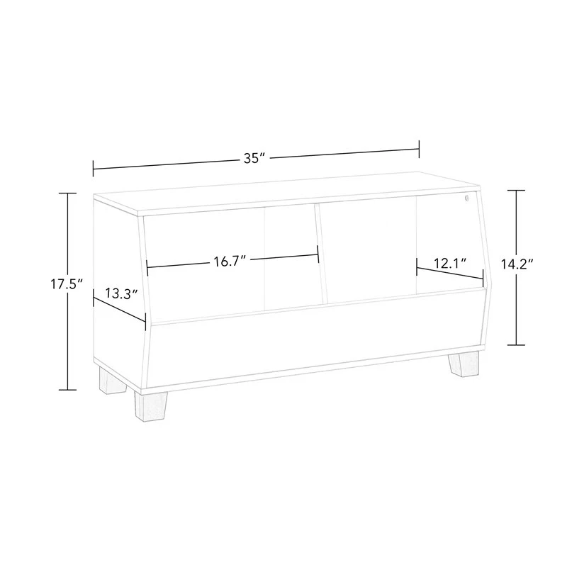 Featuring two wide storage bins, this modern toy organizer is the perfect organization solution for the playroom. With a white painted finish and five solid pine wood legs, its contemporary, yet versatile design adds functional style to any room. Load the storage bins with toys, games, stuffed animals and more. For added safety and stability, secure to the wall with the two, included adjustable anchor brackets.