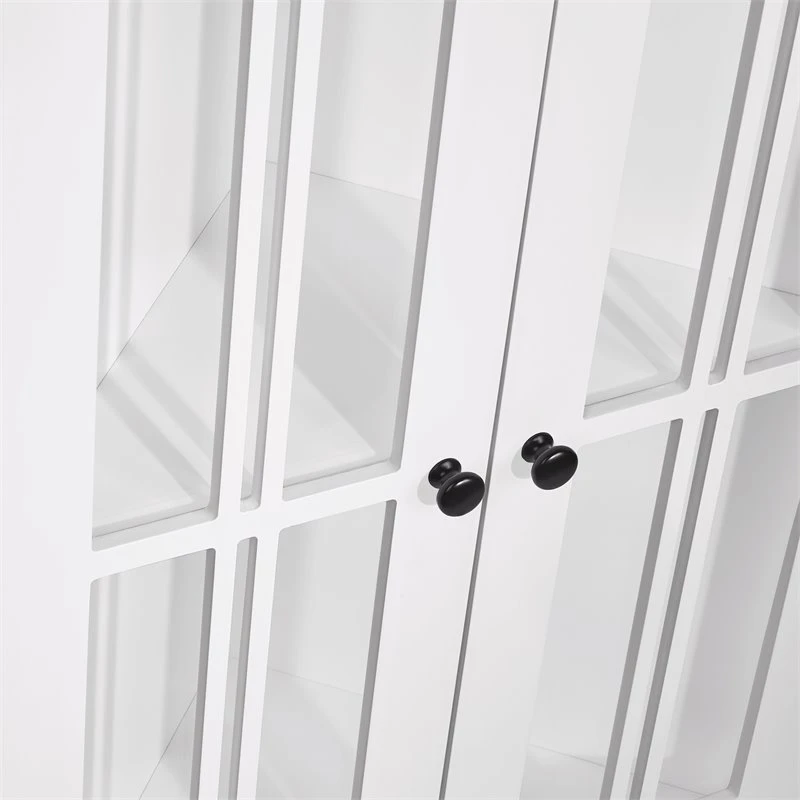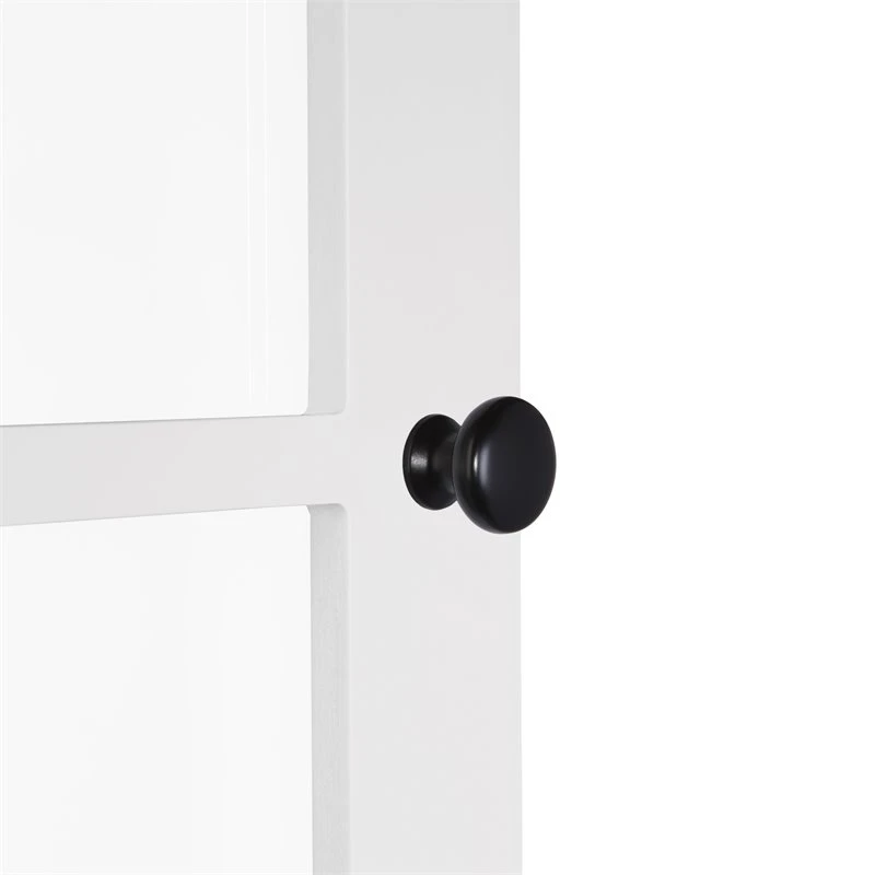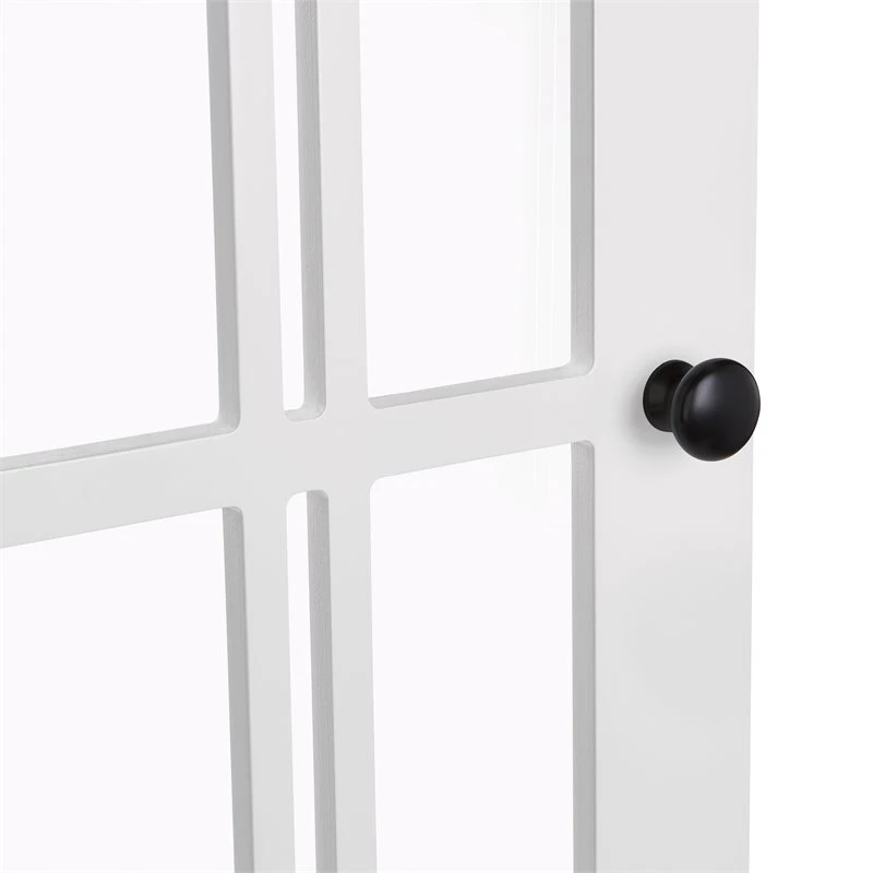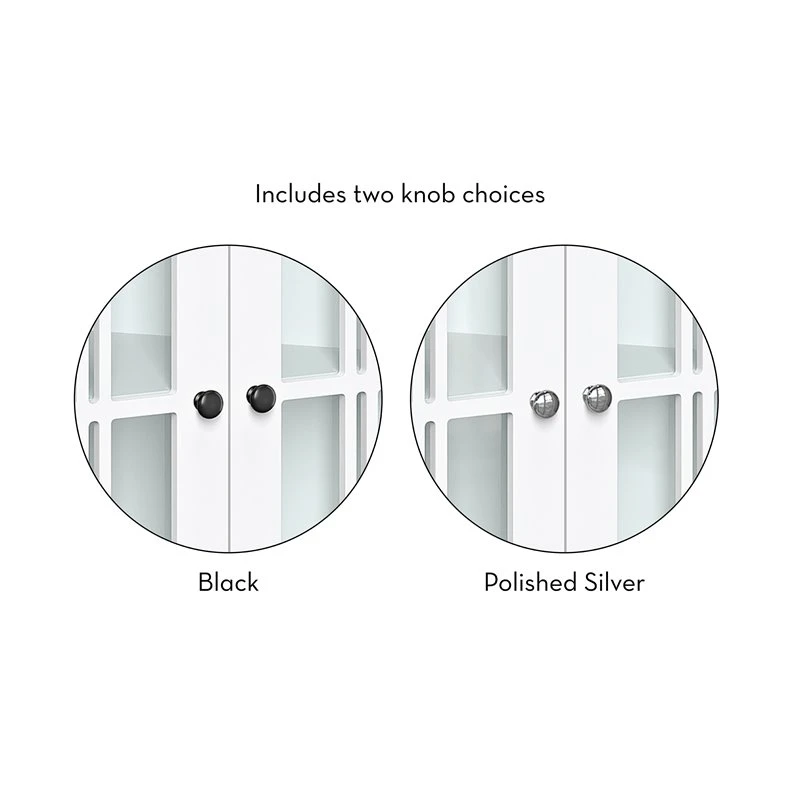 - Features two windowpane-style doors and includes two knob choices (polished silver and black)