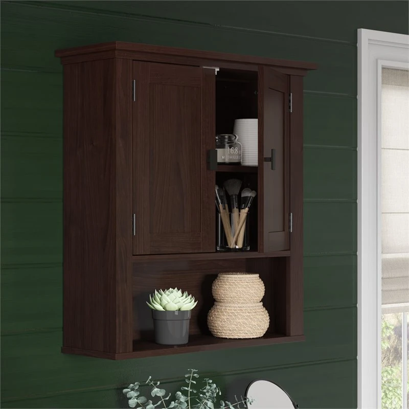 - Create a space for small toiletries and bathroom clutter with this woodgrain two-door wall cabinet