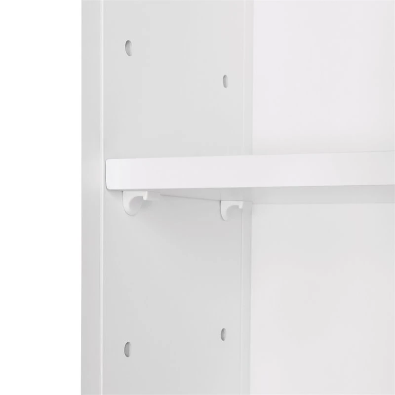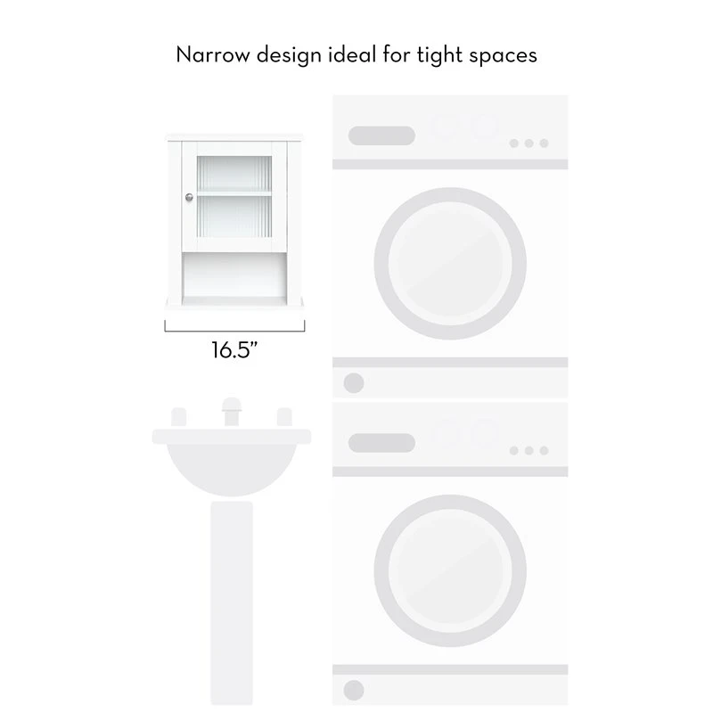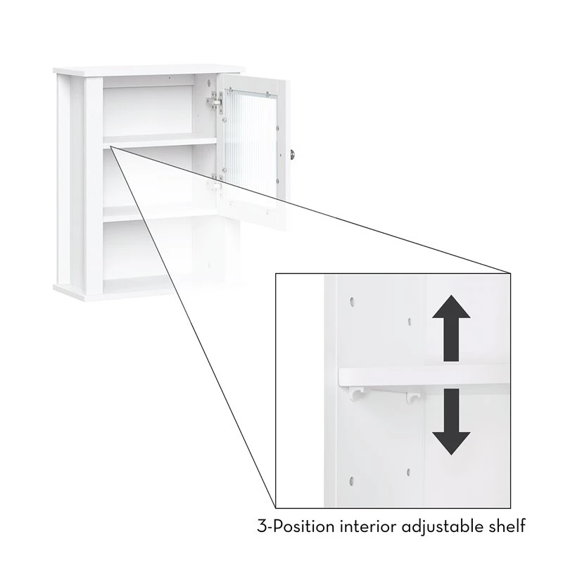 Add a touch of tasteful storage to your space with this single door wall cabinet. Featuring a reeded glass door, one open shelf and an adjustable interior shelf, this cabinet makes an ideal organization solution for tight spaces. Store wash cloths and extra toiletries behind the soft-close door and display your favorite bathroom decor on the open shelf below. With a smooth, white painted finish and polished doorknob, this cabinet includes instructions for easy assembly and wall mounting. Give your space an organizational makeover with the entire RiverRidge Home Prescott Collection.