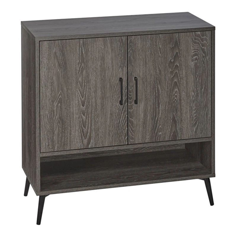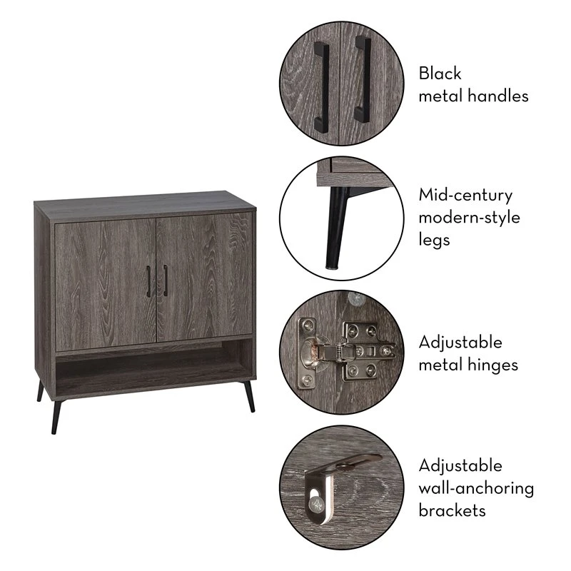 The modernized design of the RiverRidge Woodbury Collection Shoe Cabinet features one open shelf and three interior shelves behind two cabinet doors. Place several pairs of shoes on the three interior shelves and utilize the additional storage below for more shoes, decor or other, smaller items. Additional dimensions: long open shelf: 28.63-in. W x 13.38-in. D x 5.75-in. H, area inside doors: 28.63-in. W x 13.38-in. D x 17.75-in. H, inside fixed bottom shelf: 28.63-in. W x 13.38-in. D x 5.5-in. H, and inside adjustable shelves: 4.18-in. to 6.81-in. H.