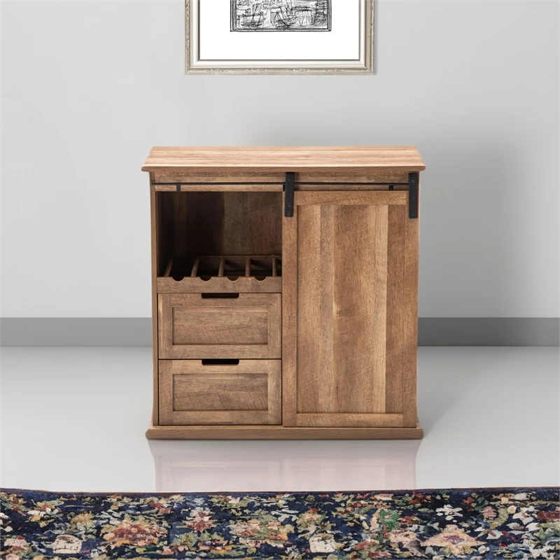 Boasting a sturdy built of MDF, metal, and solid wood, this rustic wine cabinet brings sophisticated storage to your bar space. Finished in the hue of natural brown with wood grain details, it comes with a barn sliding door complemented with two drawers, two cubbies, and bottle storage space.