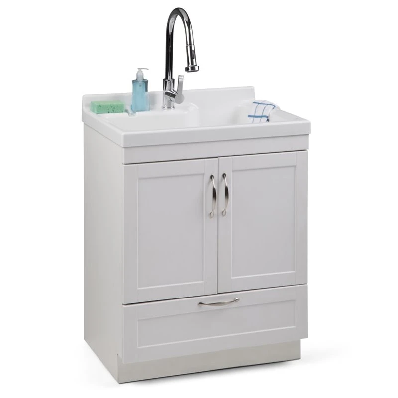 Upgrade your laundry room with the Maile 28 inch Laundry Cabinet. The laundry cabinet includes a single lever high-arc faucet and extra deep ABS sink. The Shaker-style doors and drawer open to reveal ample storage space.