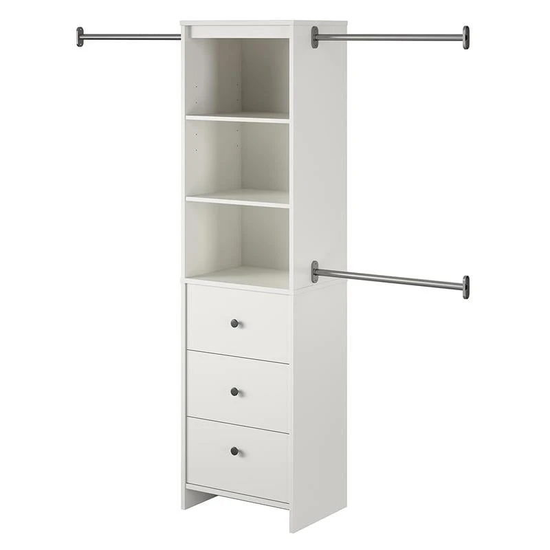 - The simple, yet sleek look of this system brings just enough storage with 3 adjustable clothing rods, 3 shelves, and 3 concealed drawers. Finished in a light gray paper laminate, this sturdy particleboard and metal combination will last for years