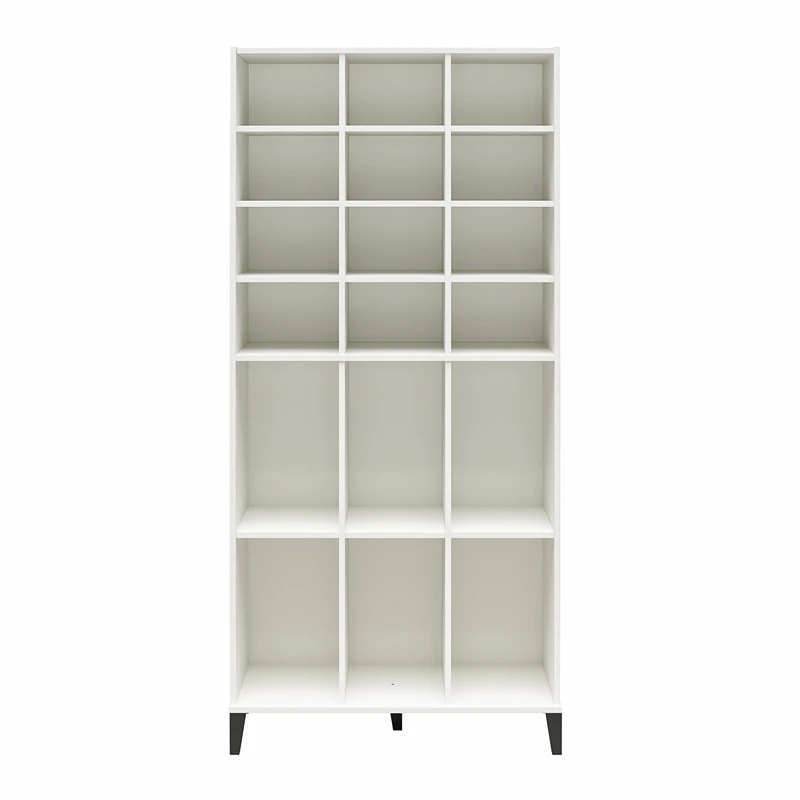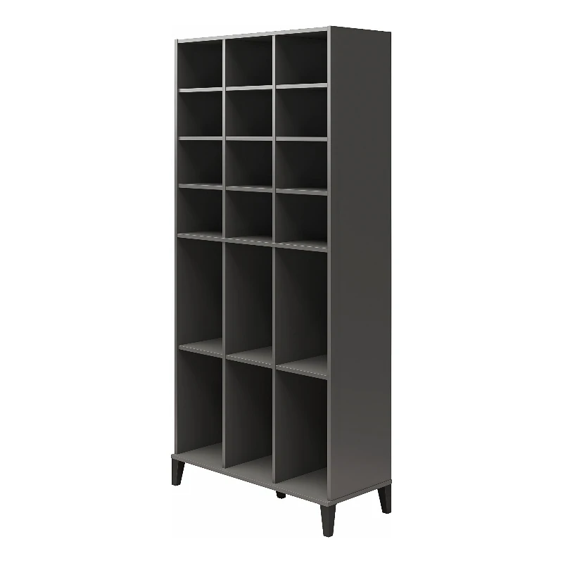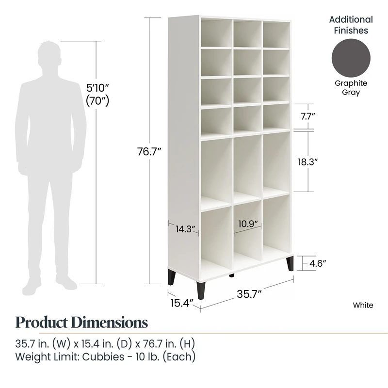- Overall product dimensions: 35.67″ W x 15.39″ D x 76.65″ H. Interior Storage dimensions: (12) storage spaces 10.96″ W x 7.74″ H x 14.33″ D. Interior Storage dimensions: (6) storage spaces 10.96″ W x 18.31″ H x 14.33″ D.