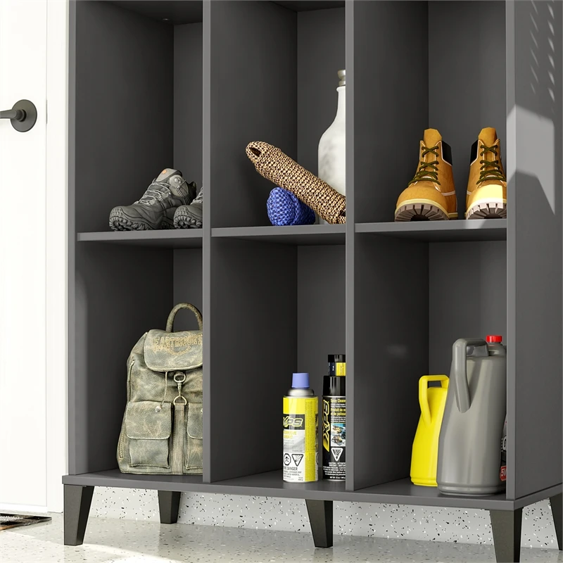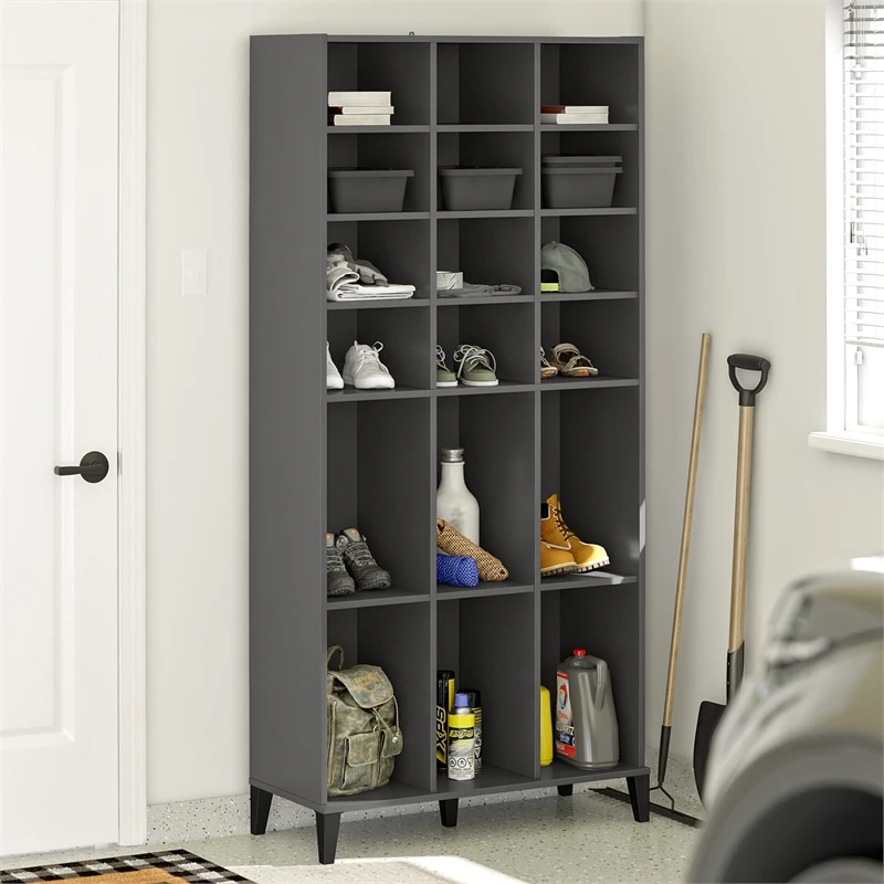 - 12 Cubbies for tennis shoes, pumps or sandals and 6 cubbies for tall shoes and boots
