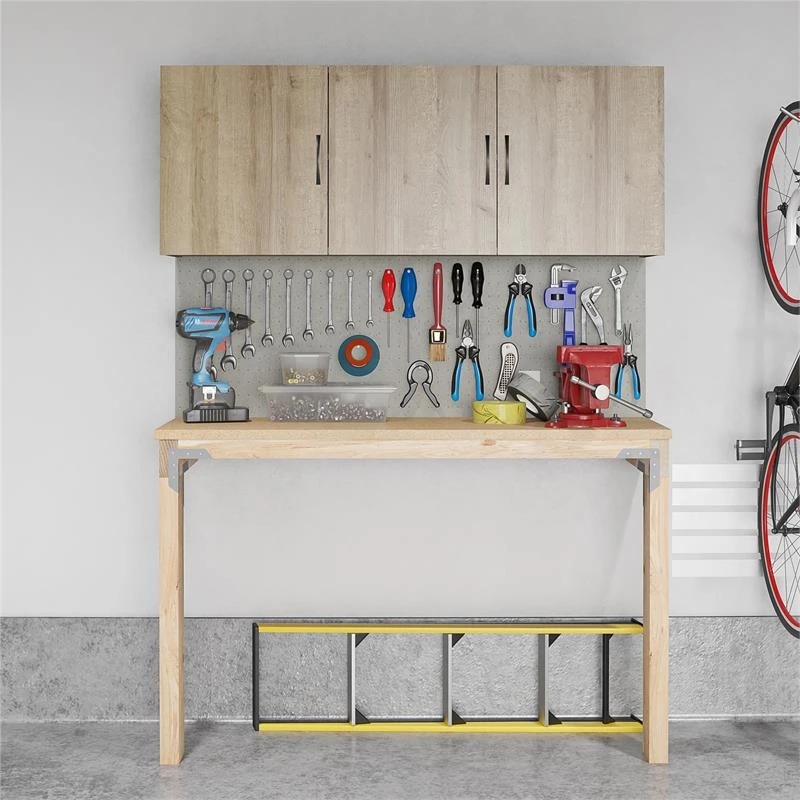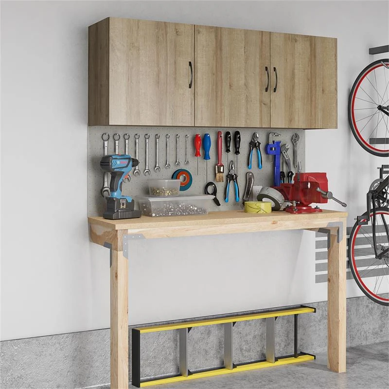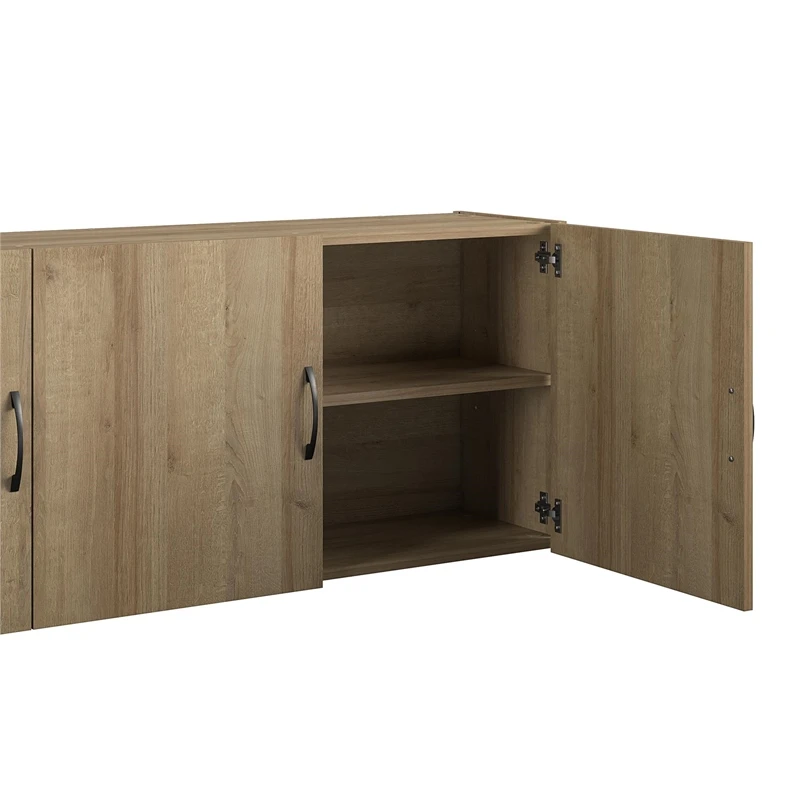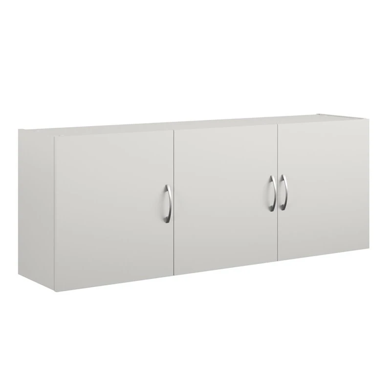 - Two shelves, 1 adjustable, behind the 3 doors provides optimal storage for cleaning supplies, office supplies, or crafting tools. EZ Hang system gives you a level and sturdy hang on the first try