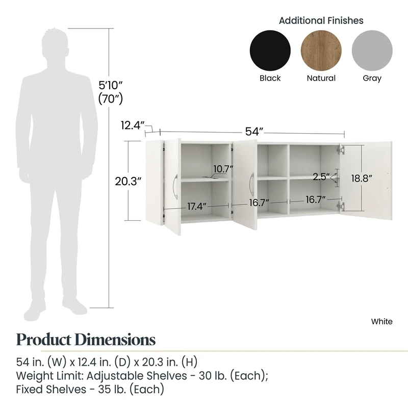 - The Wall Cabinet ships flat to your door and 2 adults are recommended to assemble. Each shelf will hold up to 30 lbs. Assembled dimensions: 20.31”H x 54”W x 12.44”D