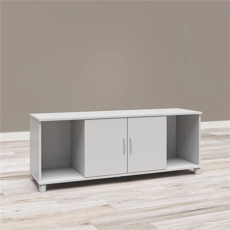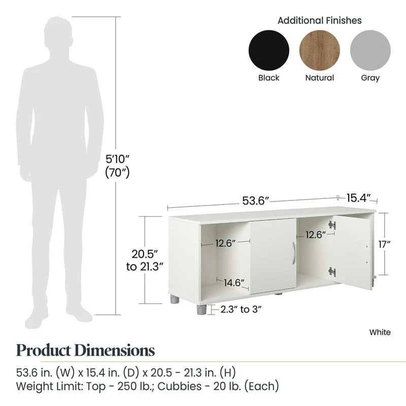 SystemBuild Evolution brings you a convenient seat and must have shoe storage right where you need it with the Lory Shoe Storage Bench. This Storage Bench is the perfect solution for your mudroom, garage, or garage entryway. With adjustable feet, keeping your bench level on uneven floors is simple, making placement options flexible. We’re confident you’re talented enough to put your shoes on standing up, but why would you want to when sitting down to put them on is much more pleasant in the morning? Both the bench seat and the four storage shelves below are the perfect catchall for shoes, purses and bags, kids’ backpacks, and those online returns you keep forgetting to grab on your way out the door. The two open shelves on either side of the bench are an ideal size to place a folding fabric bin (sold separately) to create closed storage or a pop of color, and the two center shelves are concealed behind two cabinet doors attached by sturdy European style hinges. Use this piece as a stand-alone item, or combine it with additional SystemBuild Evolution Lory items to get organized and create the perfect storage solution for every area of your home. The Storage Bench ships flat to your door and 2 adults are recommended to assemble. Once assembled, the Bench measures to be 20.5” H x 53.58” W x 15.4” D and weighs 51 lbs.