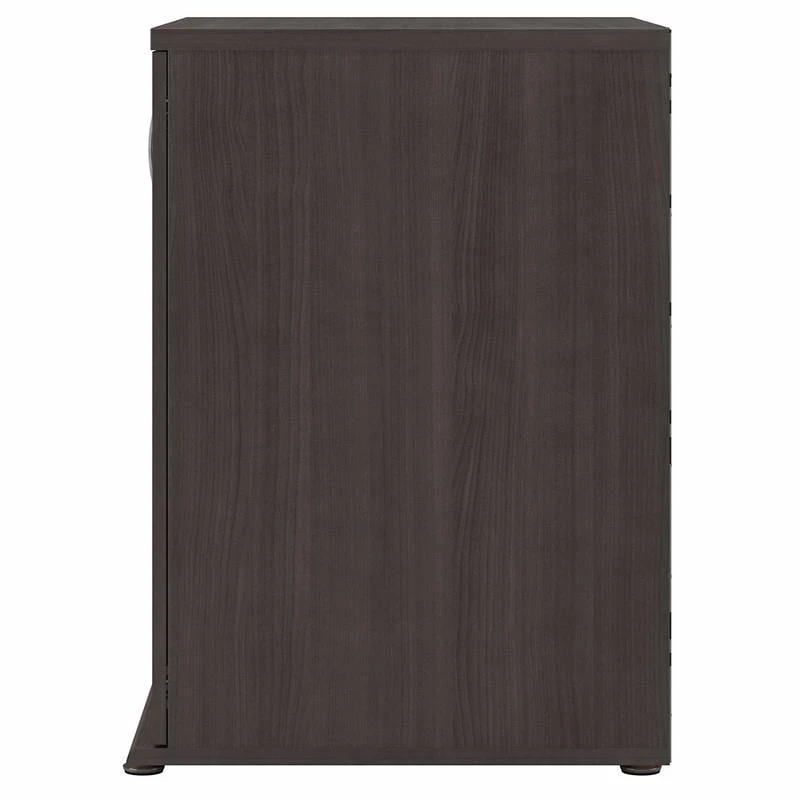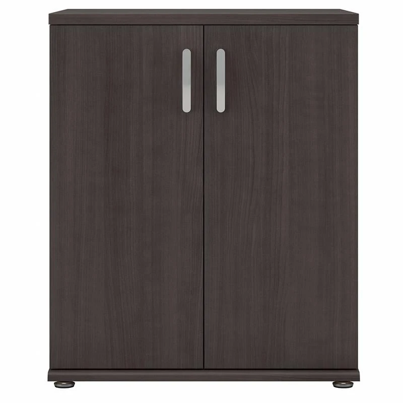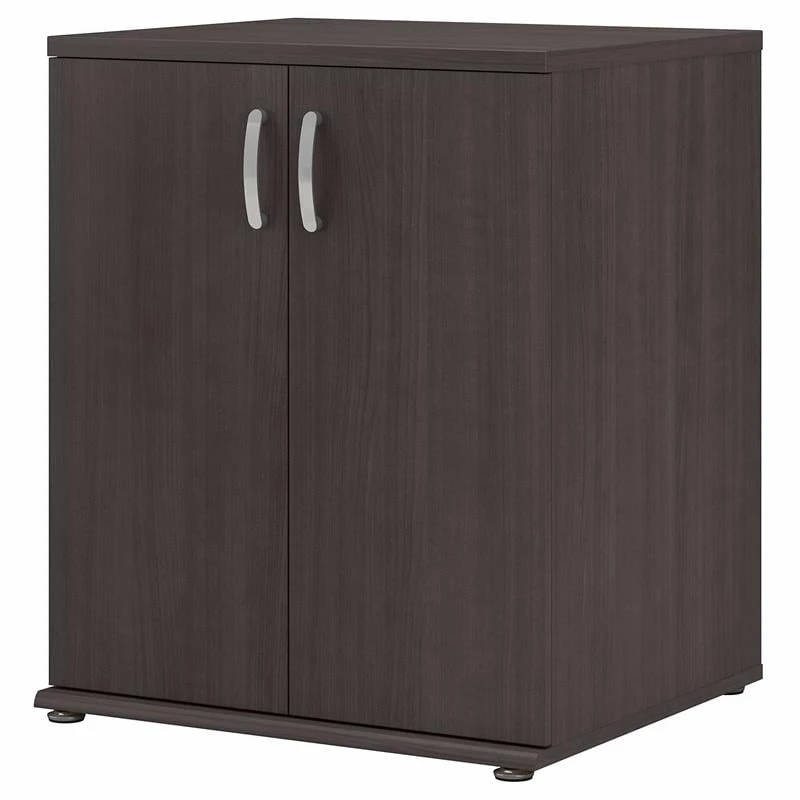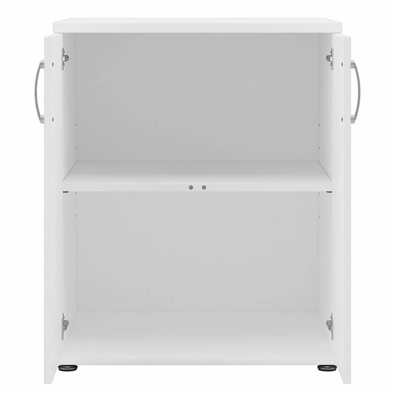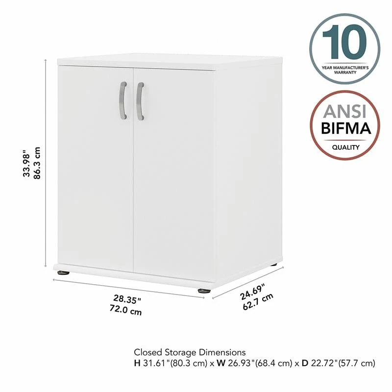 The Bush Business Furniture Universal Garage Storage Cabinet with Doors and Shelves features a commercial quality design that’s built to last and provides ample room for organization. Store tools, supplies and household items inside a practical garage cabinet that promises to maintain its contemporary style throughout years of reliable use. Cabinet doors with smooth Euro-style hinges open to reveal one fixed shelf and one adjustable shelf that accommodate items of various sizes. Each shelf supports up to 50 pounds, so storing larger materials is no problem. The freestanding floor cabinet’s base has adjustable levelers to compensate for uneven surfaces and wall attachment hardware is included for family-friendly safety. This 2 door storage cabinet has been meticulously tested to meet or exceed ANSI/BIFMA quality standards for safety and performance and is backed by a 10 Year Warranty.