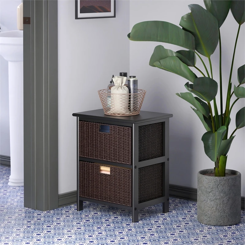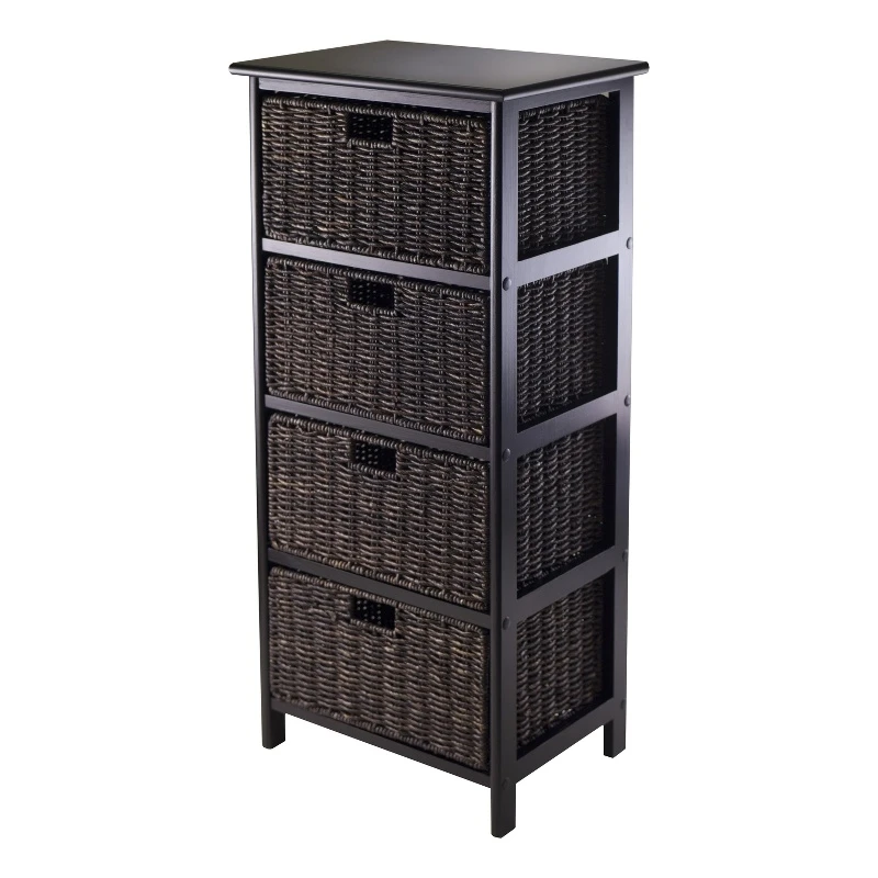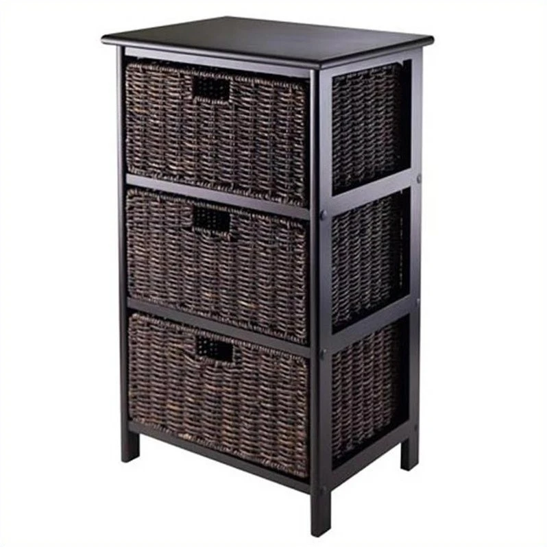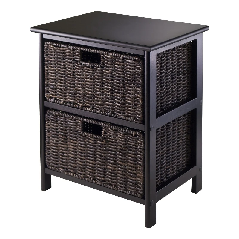 Keep organized and clutter-free by using the Winsome Wood Omaha Storage Rack with 2 Baskets. This set provides accentual contemporary storage to your family room, living room, or bedroom with a simple, open and clean design. The compact storage rack is created with two sturdy shelves in a black finish constructed of sturdy solid and composite wood. Included is a set of 2 foldable baskets that are manufactured from re-purposed corn husk in a chocolate tone, with built-in handles for easy access and mobility and that fit perfectly on the spacious shelves. Ideal for storing magazines, games or the remote controls, these baskets provide plenty storage and organization. When not in use, baskets fold up for easy storage taking up almost no space. This unit is ideal for adding extra storage in any room of your home such as a bathroom, bedroom, craft space, play room or kitchen. Display a lamp or family portrait on the top and this will make a great end table in the living room, for larger rooms, complete the look with a table on each end (each sold separately). Complete your living area with the additional items from the Winsome Omaha collection for a unified space (each sold separately). Assembly is required for the storage rack, while the baskets are shipped folded but are ready to use by simply prompting up. Conveniently packed and shipped in 1 box, along with the hardware necessary for assembling the table. Replacement part request can be submitted directly to the manufacturer within 60 days from date of purchase.