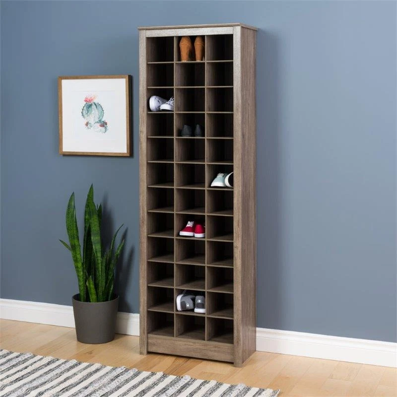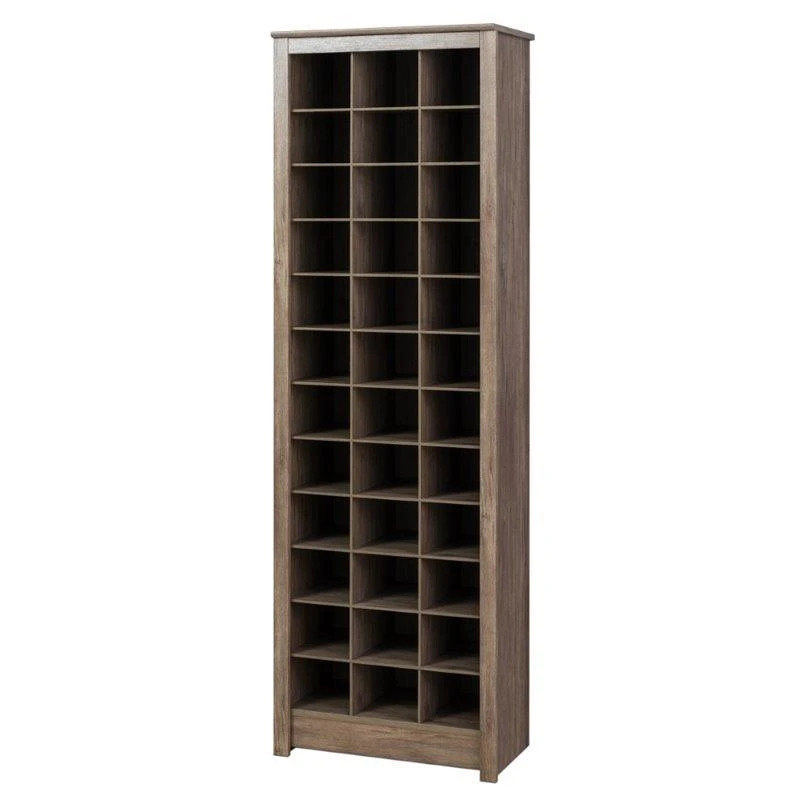 Simply and stylishly organize up to 36 pairs of shoes with the Space-Saving Shoe Storage Cabinet by Wright Home. Fit one cabinet in a narrow entryway or combine multiple pieces from the Space-Saving collection in a large mudroom to create a custom closet look at the fraction of the cost. This shoe organizer has 36 spacious cubbies that can be used to store shoes, hats, scarves, keys, mail and any other clutter that needs organizing. Finished in Drifted Gray laminate. Assembled Dimensions 23.5”W x 72.5” H x 13” D. Dimensions for each cubby 7”W x 5.25”H x 11.75”D. Constructed from clean, laminated composite woods with a sturdy MDF backer. Ships Ready to Assemble, includes an instruction booklet for easy assembly and has a 5-year manufacturer’s limited warranty on parts. Manufactured in Canada and meets all North American safety standards.