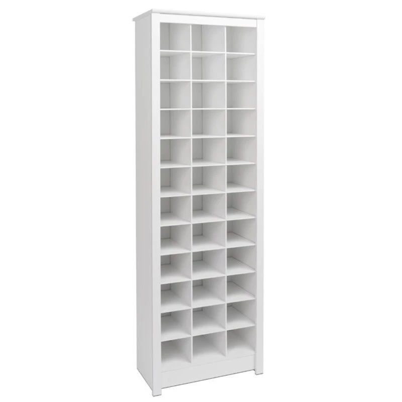 Simply and stylishly organize up to 36 pairs of shoes with the Space-Saving Shoe Storage Cabinet by Wright Home. Fit one cabinet in a narrow entryway or combine multiple pieces from the Space-Saving collection in a large mudroom to create a custom closet look at the fraction of the cost. This shoe organizer has 36 spacious cubbies that can be used to store shoes, hats, scarves, keys, mail and any other clutter that needs organizing.